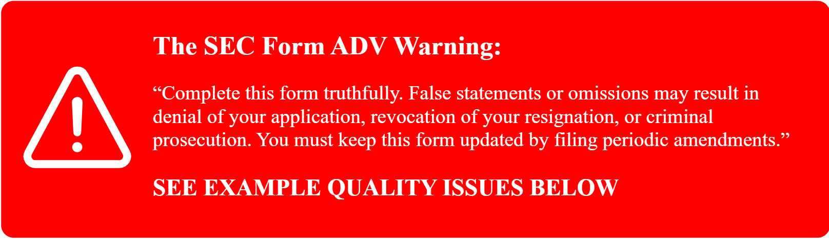 Our Regulatory Filing Quality report (RFQ™) is designed to help Chief Compliance Officers improve the quality of information they file in Form ADV, Form D, Form 13F,-D-G, and Form NCEN/NPORT.